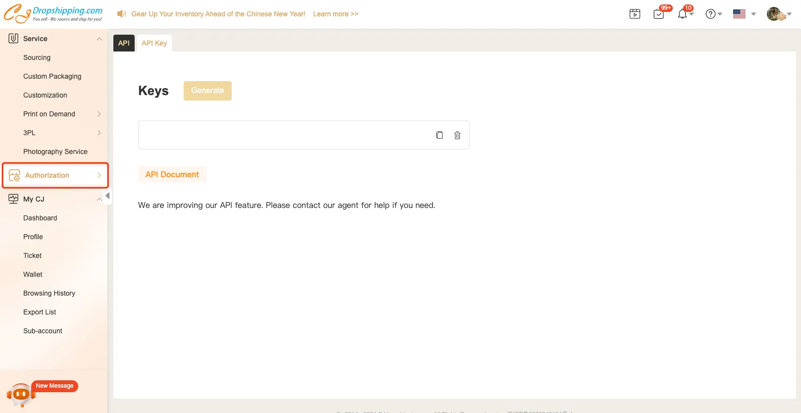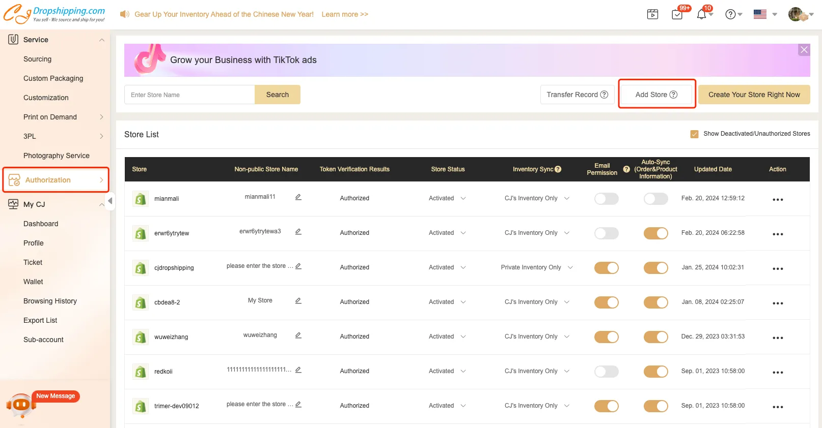 在建立您商店中的产品与 CJ 上的产品之间的联系并将订单同步到 CJ 之前,您需要授权您的商店。