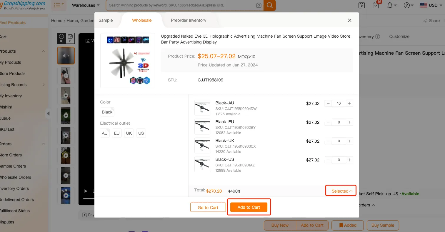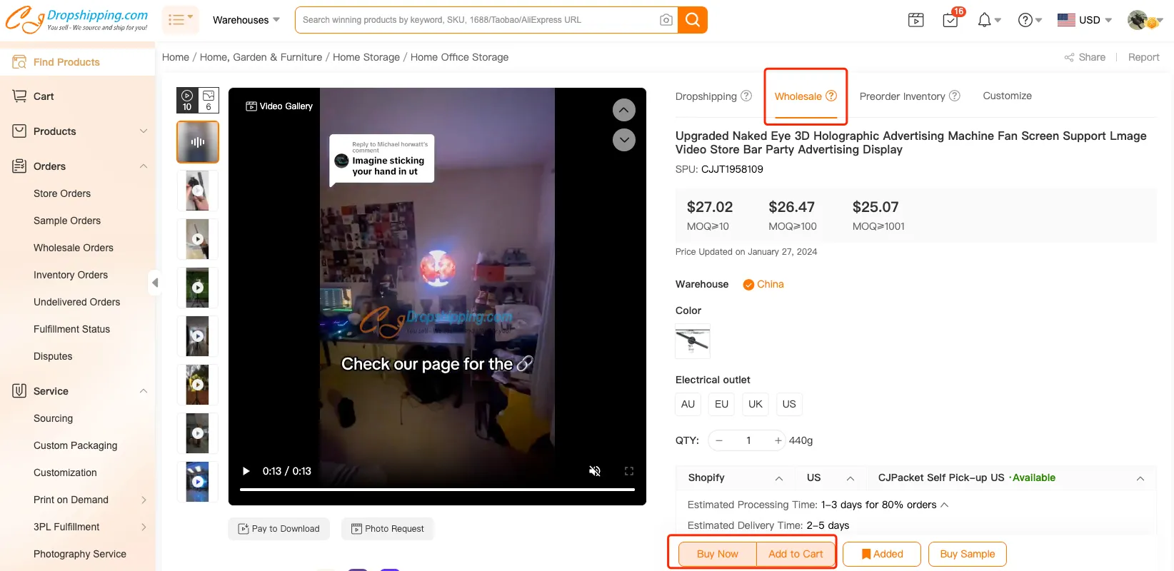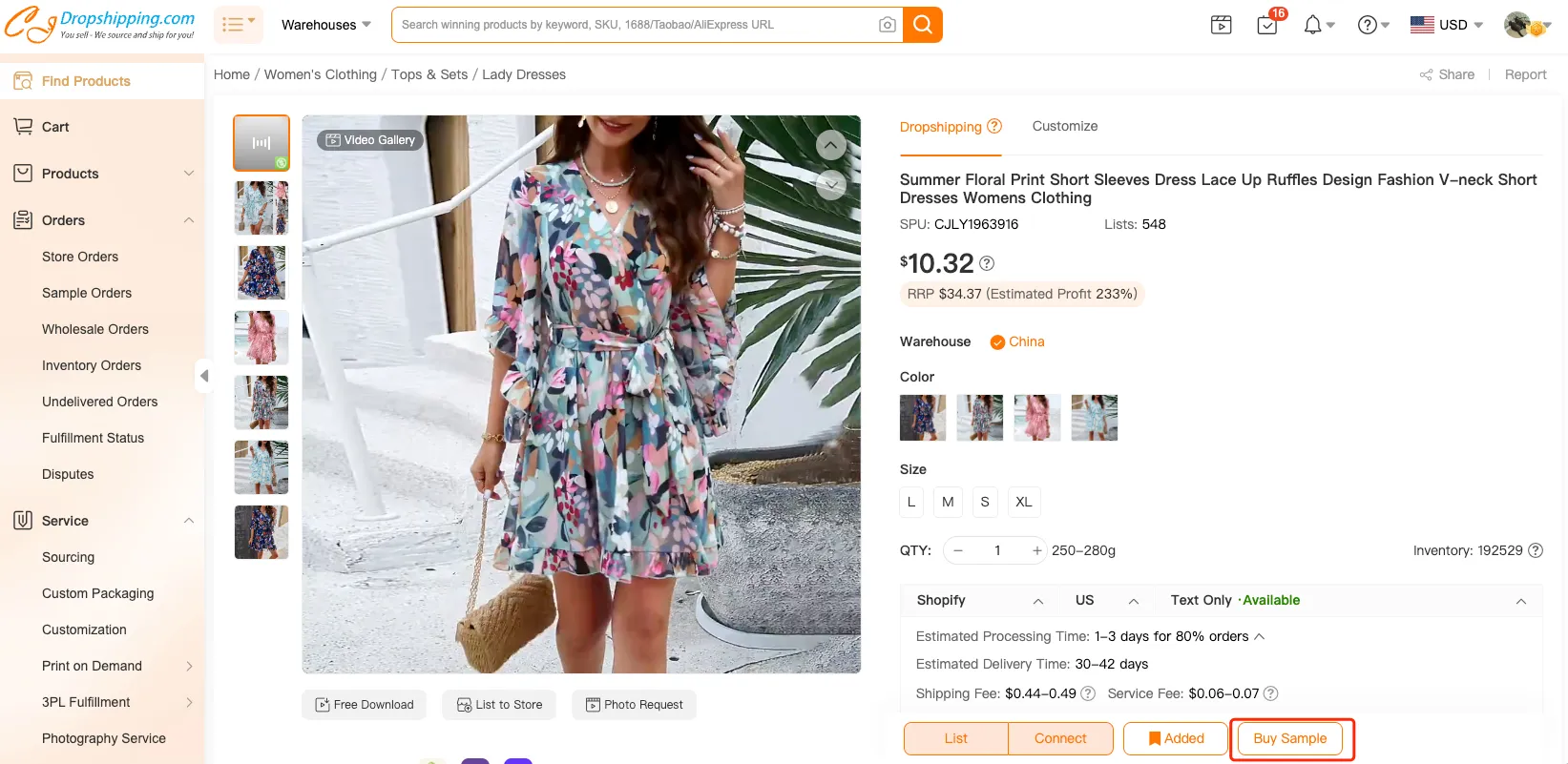 如果该产品没有批发选项,您可以在“产品代发货”页面点击“购买样品”。