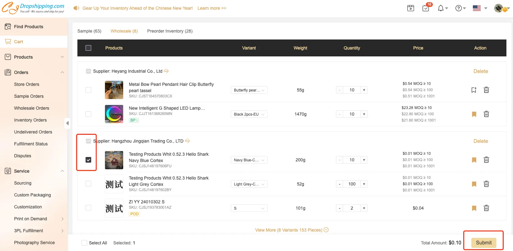 3. 进入购物车-批发页面,选择产品, 然后提交订单。
