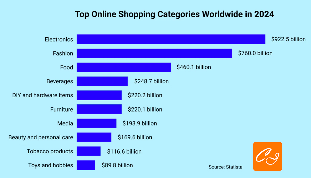 Online shopping encompasses virtually every retail category today, but a few product categories consistently lead in revenue. As of 2024, the top categories worldwide by online sales were: electronics, fashion, food (grocery), beverages, home improvement/DIY, furniture, media, beauty & personal care, tobacco alternatives, and toys/hobbies, in that order. Electronics alone accounted for nearly $922.5 billion of online spending globally in 2024 – the single largest slice of e-commerce. Fashion and apparel were a close second at around $760 billion. Food and beverages together also formed a massive segment, as online grocery shopping and delivery became firmly entrenched in consumer habits.
